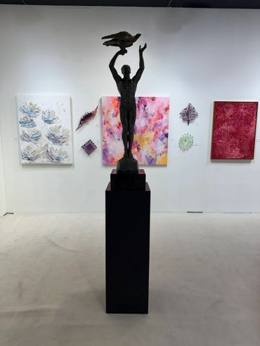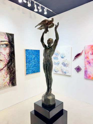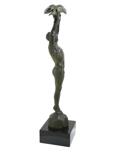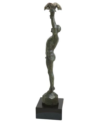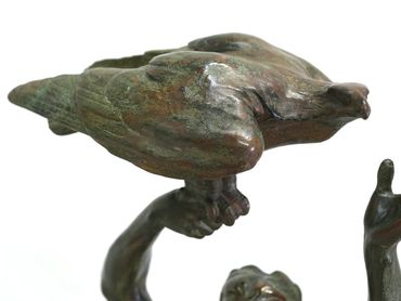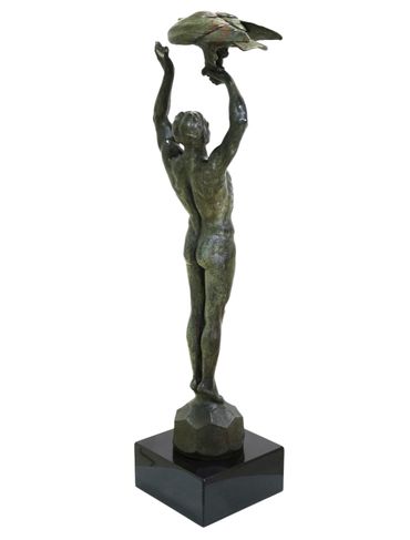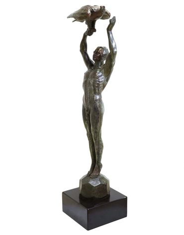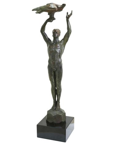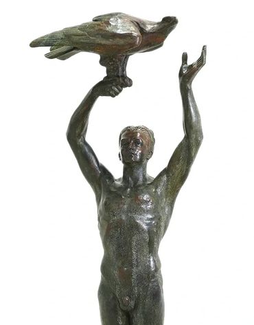 An impressive portrayal in bronze of a youth releasing an eagle to hunt. Otto Poertzel trained as a porcelain modeller at Kister Factory in Scheibe. In 1893, he studied at the Technical Academy for Porcelain in Sonneberg under Prof. Möller. From 1900, he was an independent sculptor in Coburg. In 1908, he had his own studio in Munich and attended the Academy of Art under Prof. Hildebrand. In 1913, he was a professor. Participant in significant exhibitions, including exhibits of his larger pieces at the world fairs in St. Louis and Brussels.