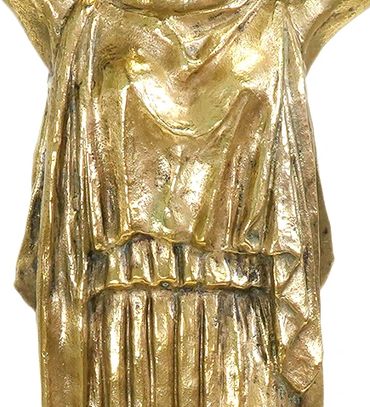Called a peplophoros, this small sculpture is inspired by Greek originals of about 470 B.C. It portrays a woman wearing a peplos, a garment that was pinned at the shoulders and belted at the waist, creating straight, heavy folds to the feet. Her raised arms imply that she may be dancing. The cobra at her feet adds interest and intrigue, possibly from a lost ceremony.