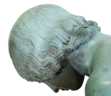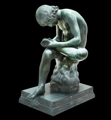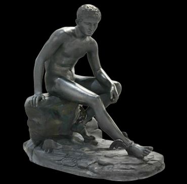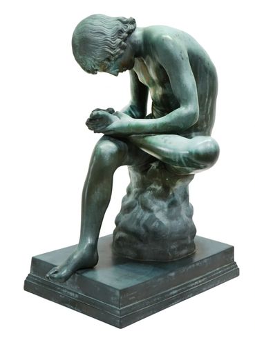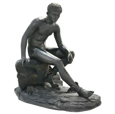 A large-scale and very finely modeled Grand Tour bronze sculpture. The Greco-Roman "Spinario" or the "Boy with Thorn", in the Capitoline Museum of Rome is the original that inspired this sculpture. The beautiful verdigris patina is the natural result of being outside in a garden for several decades.