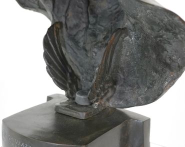 An impressive portrayal in bronze of a youth releasing an eagle to hunt. Otto Poertzel trained as a porcelain modeller at Kister Factory in Scheibe. In 1893, he studied at the Technical Academy for Porcelain in Sonneberg under Prof. Möller. From 1900, he was an independent sculptor in Coburg. In 1908, he had his own studio in Munich and attended the Academy of Art under Prof. Hildebrand. In 1913, he was a professor. Participant in significant exhibitions, including exhibits of his larger pieces at the world fairs in St. Louis and Brussels.