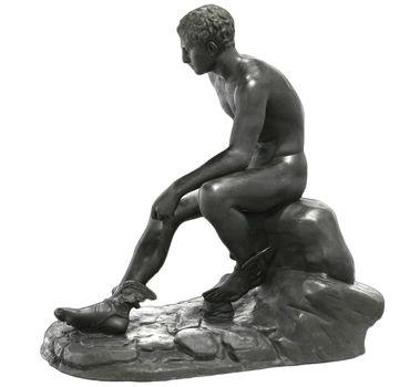 Arrotino is sharpening his knife, as he is about to flay the satyr Marsyas, who lost a flute competition with the gods. For his hubris, he was strung up and will have his skin removed, according to the myth.