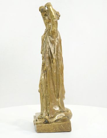 Called a peplophoros, this small sculpture is inspired by Greek originals of about 470 B.C. It portrays a woman wearing a peplos, a garment that was pinned at the shoulders and belted at the waist, creating straight, heavy folds to the feet. Her raised arms imply that she may be dancing. The cobra at her feet adds interest and intrigue, possibly from a lost ceremony.