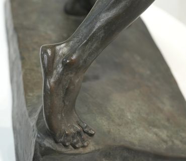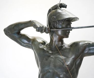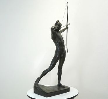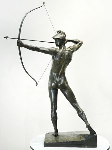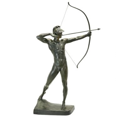 The Archer is Geyger’s most celebrated work. The Gladenbeck foundry acquired the rights to cast reductions in bronze and edited them in three sizes, with one such model appearing on the front of their 1903 catalogue. While Geyger's inspiration ultimately derives from antiquity and more specifically from an ancient torso of a wrestler in Berlin, his particular achievement lies in the fresh and modern reinterpretation of the Ideal, harnessing a stylised male physique in a composition full of the undiluted energy in the split second before the release of the archer’s arrow.