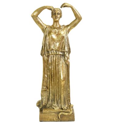 Called a Peplophoros, this small sculpture is inspired by Greek originals of about 470 B.C. It portrays a woman wearing a peplos, a garment that was pinned at the shoulders and belted at the waist, creating straight, heavy folds to the feet. Her raised arms imply that she may be dancing. The cobra at her feet adds interest and intrigue, possibly from a lost ceremony.