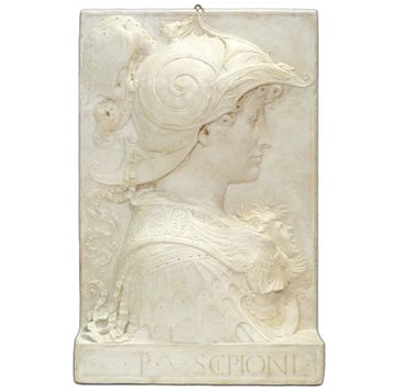 This beautiful and accurate plaster cast is of a Renaissance era relief of Scipion Africanus by Andrea del Verrochio. The level of refinement of the visage and the Roman armor is nothing short of extraordinary.